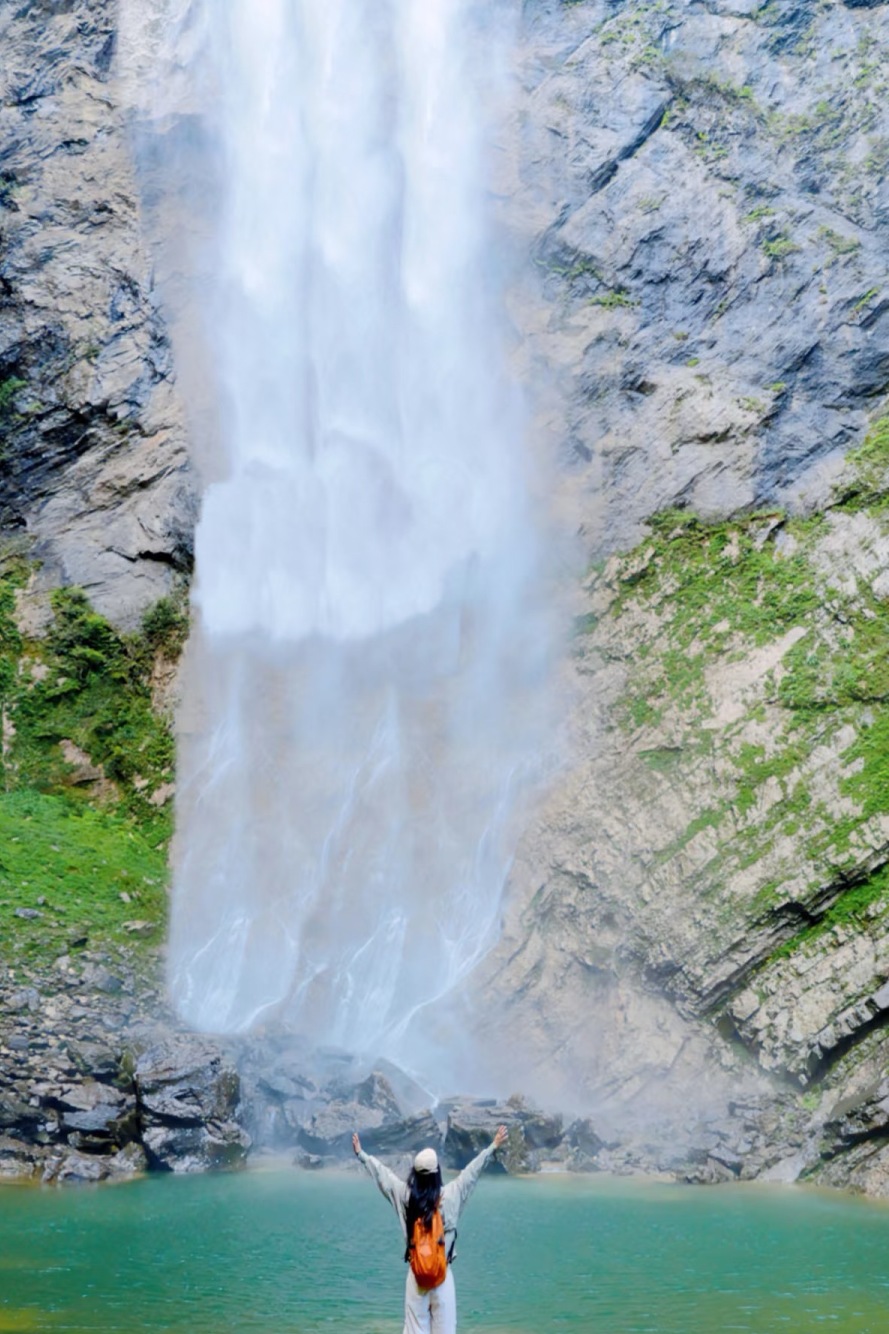 沿着依山而开的栈道前行,或穿行于蜿蜒的石阶小路之间,面前一座座山峰层层叠叠,或庞大稳重,屹立不倒;或壁如刀削,直耸云端。在这一段峡谷里旅行,伸手可及石壁,石壁上的连绵青苔,碧绿柔软;栈道下的河水,浪花雪白;回水潭里的莹莹碧水,澄澈明净。