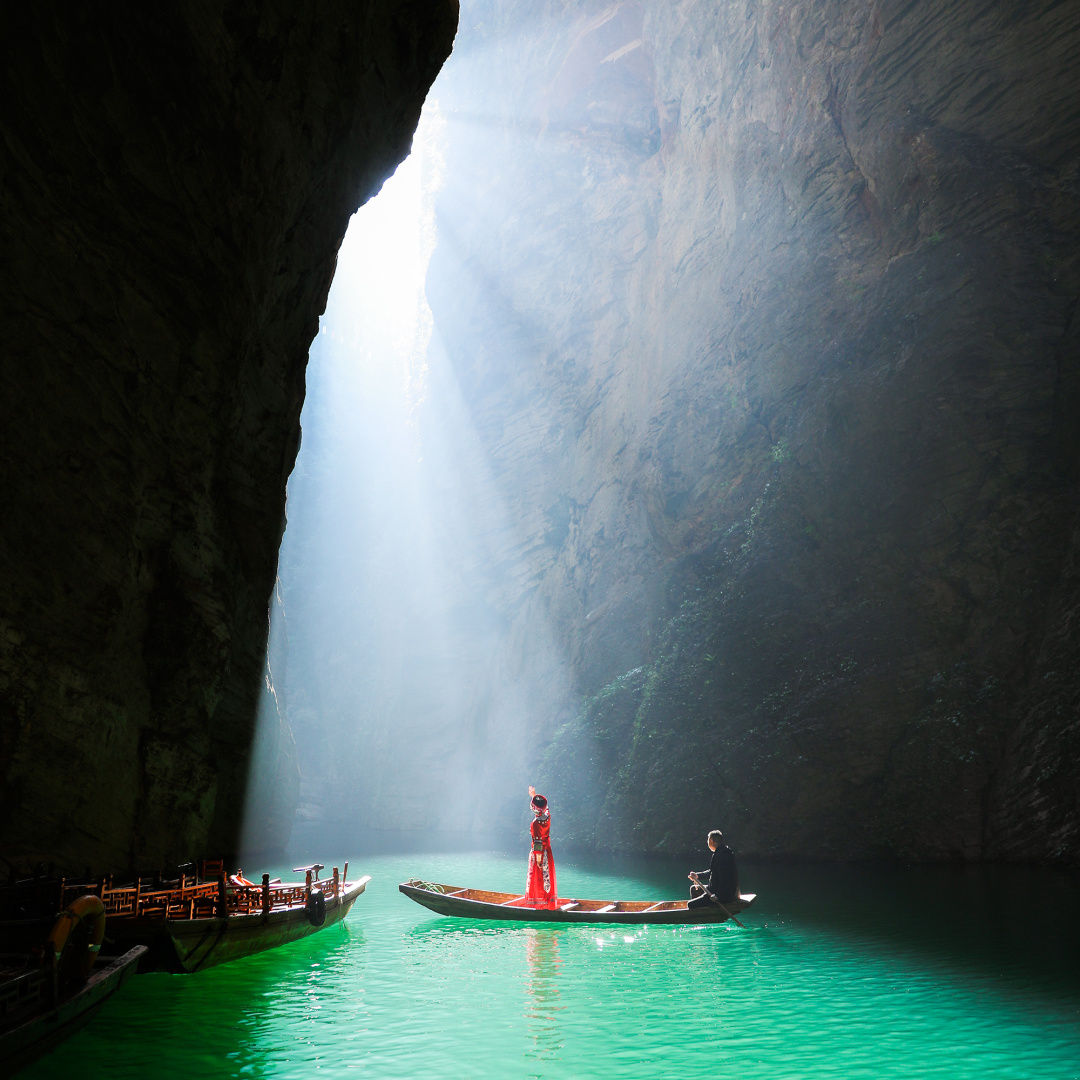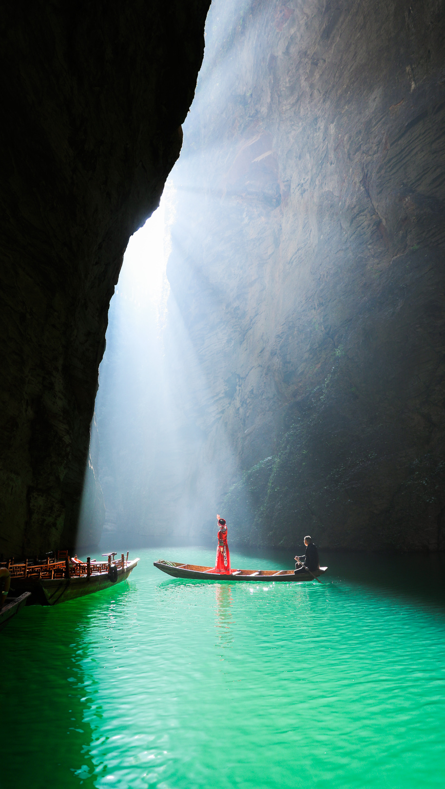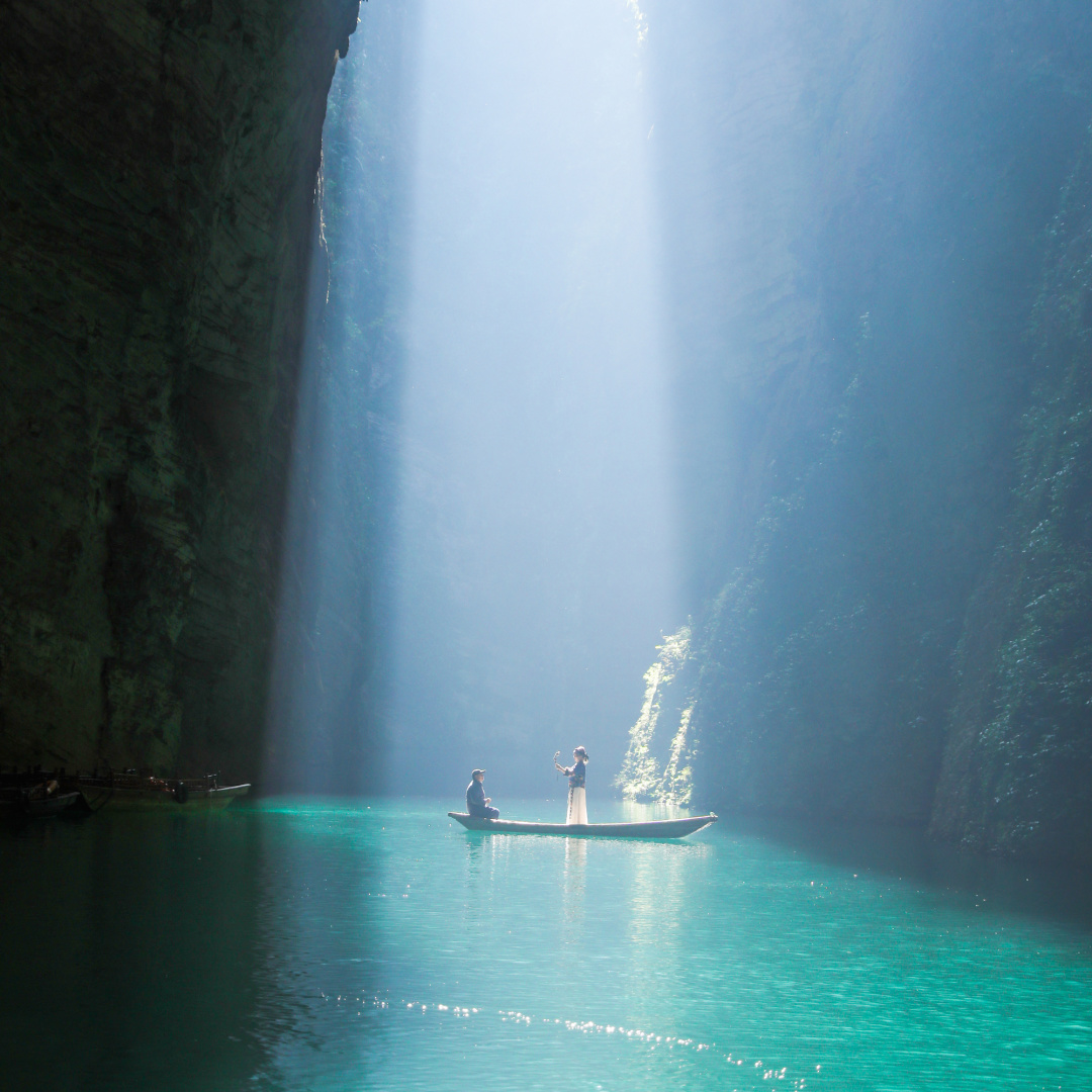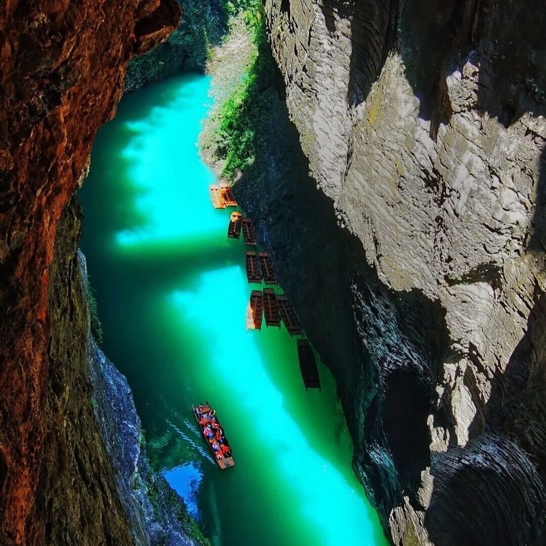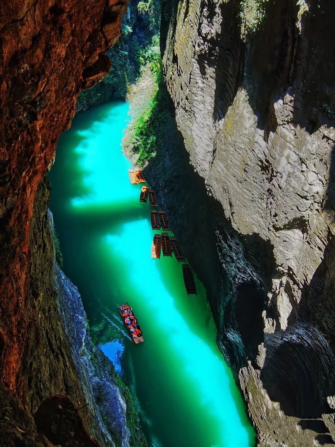 沿着景区步道下到峡谷河边,欣赏沿途的风景,角度不同,欣赏到的风景也不尽相同。峡谷深达百余丈,溪水碧蓝清澈见底。如遇晴天,阳光折射入水面,行舟于上宛如悬浮在空中一般;如遇雨天,峡谷之中因为温差情况, 会行程一层层薄薄的雾气,烟雾缭绕,如遇仙境。