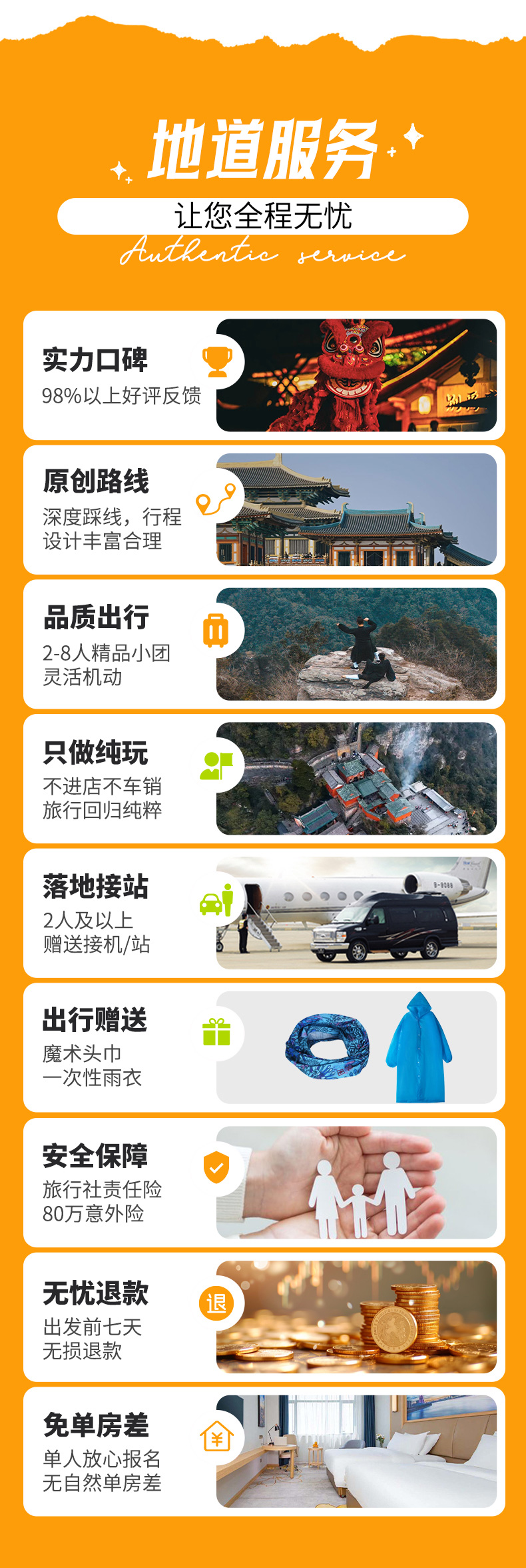 注:接机/站请提前2天告知航班号/车次,否则视为放弃此服务;赠送项目如客人自愿放弃或因特殊原因及不可抗力等原因无法参加,均不退费用,也不等价交换。