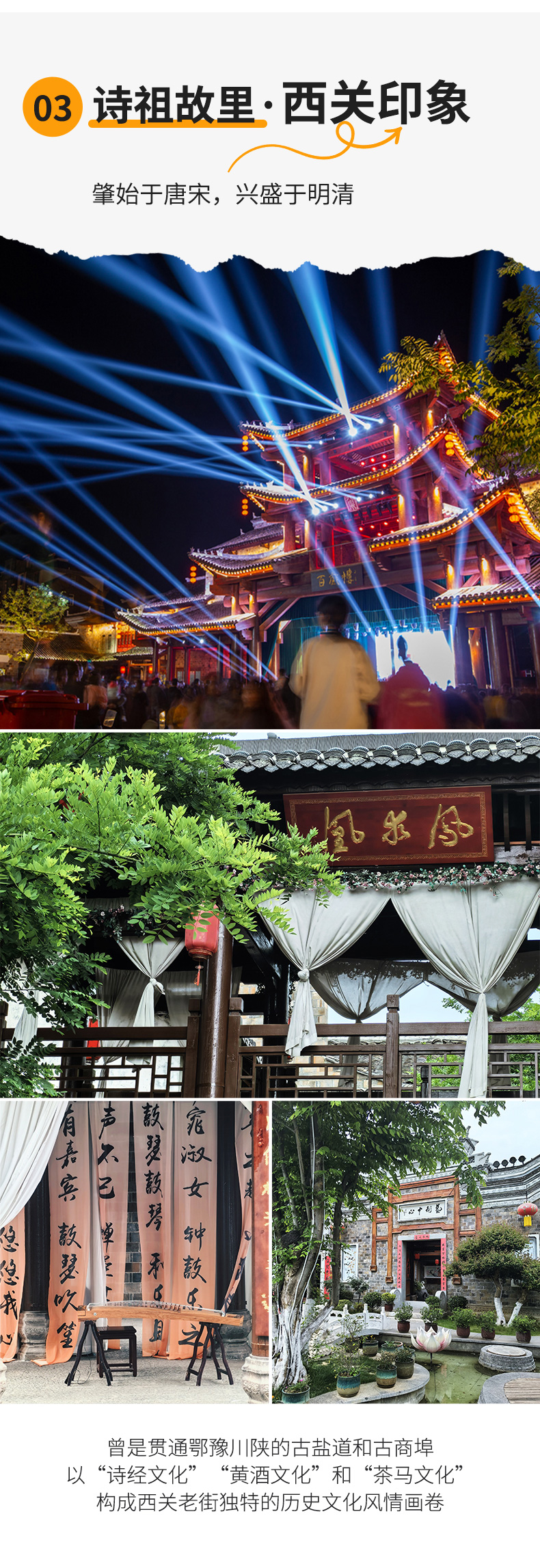 房县西关印象,肇始于唐宋,兴盛于明清,曾是一条贯通鄂豫川陕的古盐道,繁华热闹的古商埠,富绅巨贾云集,名人雅士辈出。以“诗经文化”“黄酒文化”“忠孝文化”和“茶马文化”为地标,生动还原历史街巷生活场景,构成老街独特的历史文化风情画卷。白天,这里春和景明、风光无限,是流动的人文博物馆。夜晚,这里霓虹闪烁、瑰丽无比,是烟火气十足的不夜城。