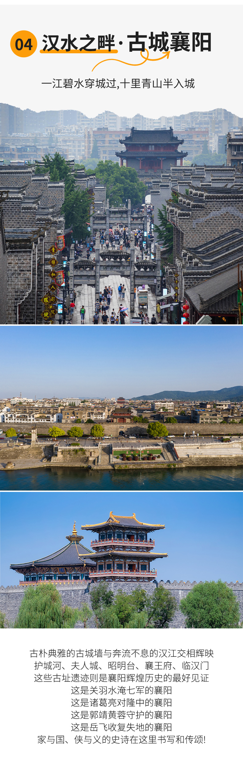 襄阳北通汝洛,西带秦蜀,南遮湖广, 东瞰吴越,素有"华夏第一城池"之称,历代兵家必争。它是金庸笔下的侠义之城,孟浩然从这儿走过,留下"山水观形胜"的名篇,米芾从这儿走过,留下体势骏迈的传世书法。