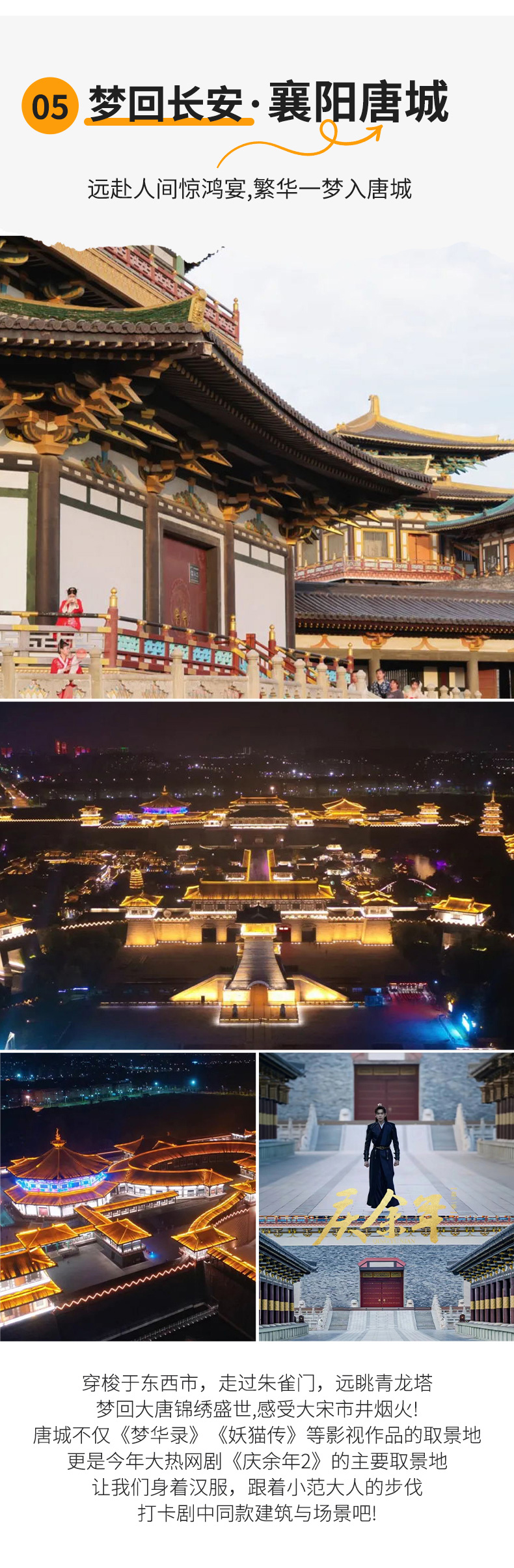 唐城影视基地是国家AAAA级旅游景区,东连汉水,南眺鹿门,西依岘山,北接古城,依托襄阳建城2800年的厚重历史文化底蕴, 唐城将利用各种表现形式来展示盛唐文化,把汉江活水引入城内,通过8座桥梁与城内8条水系连接,形成“八水绕长安”的格局,打造自然诗画形态。