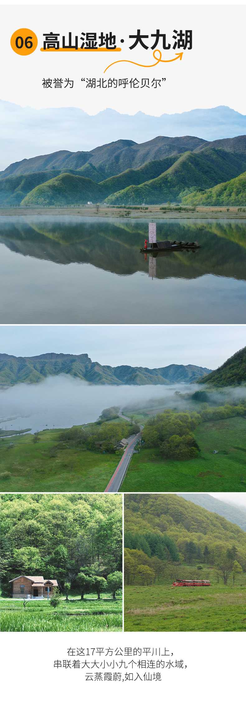 大九湖被称作是华中的呼伦贝尔,藏在深山中的一片高山草甸,弯曲的溪流在九座山梁间汇集成了大大小小的九个湖泊。