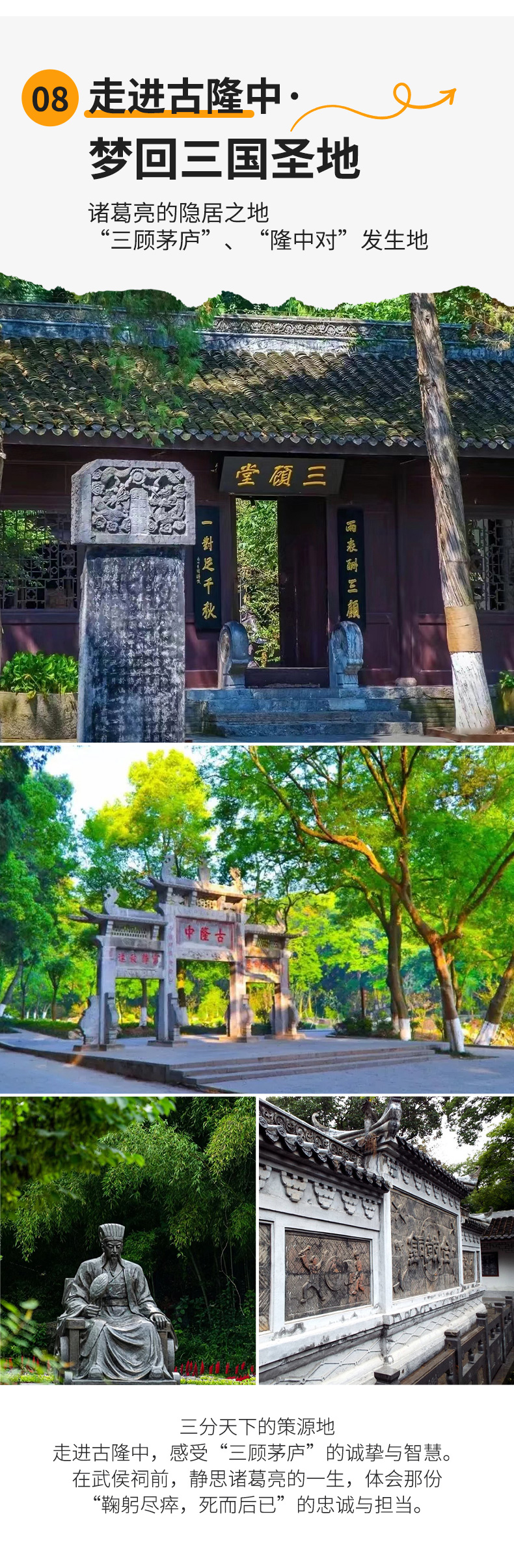 古隆中已有1800多年历史,因诸葛亮“躬耕陇亩”、刘备“三顾茅庐”,引发《隆中对》,被世人称为智者摇篮,三分天下的策源地,是“垂千古”“永清幽”的胜地。以诸葛亮故居等历史遗迹为主要内容,人文景观与山林田园为一体的风景名胜区。