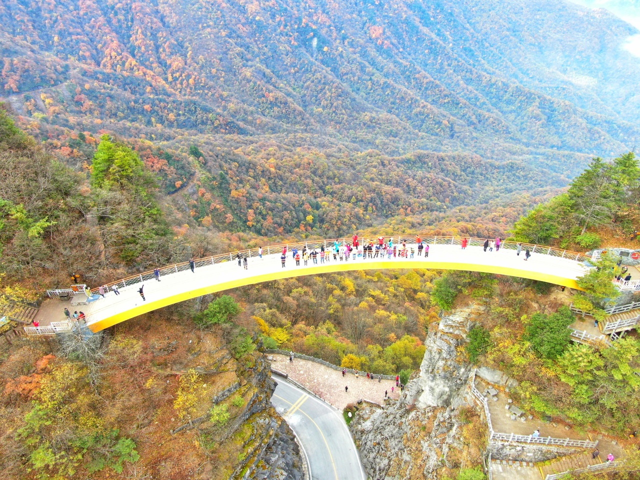 燕子垭壑口上空横跨一座全钢结构的观景桥,这座钢桥悬空高、跨度大,是亚洲海拔最高的景观桥。桥的主体是黄色远远望去,就好像挂在蓝天下的一道绚丽的彩虹。站在桥上视野开阔,极目远眺,是群峰之间的沟壑和一望无际的原始森林。