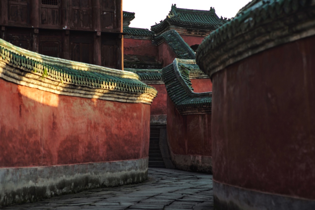 进景区后乘坐景区景交车,游览明永乐十年(1412)建设的太子坡。这里的古建筑充分利用了陡险岩石下的一片狭窄的坡地,纵横序列布局,红墙环绕,复道曲折,使建筑与环境紧密结合,有“一里四道门,九曲黄河墙,一柱十二梁,十里桂花香”四大奇景。