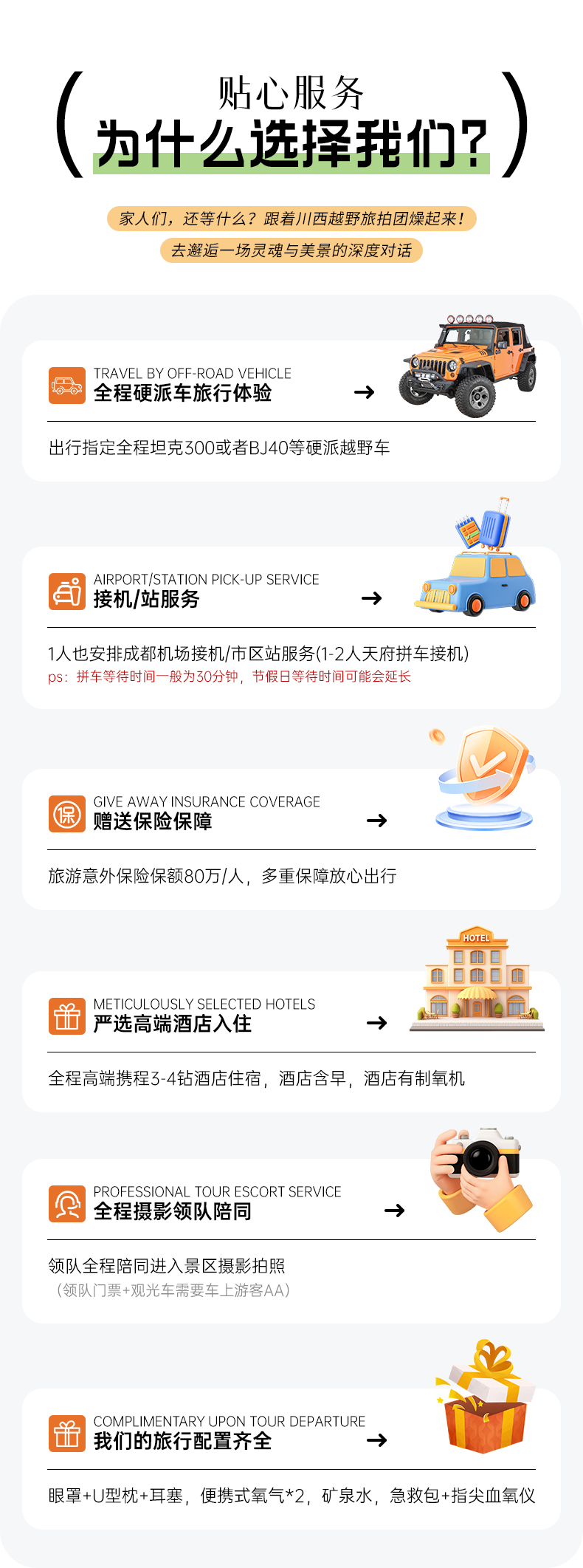 2、如果您座我们的车:全程安排硬派越野车,车型不指定保证安排越野越野车出行,保证每人一正座;
