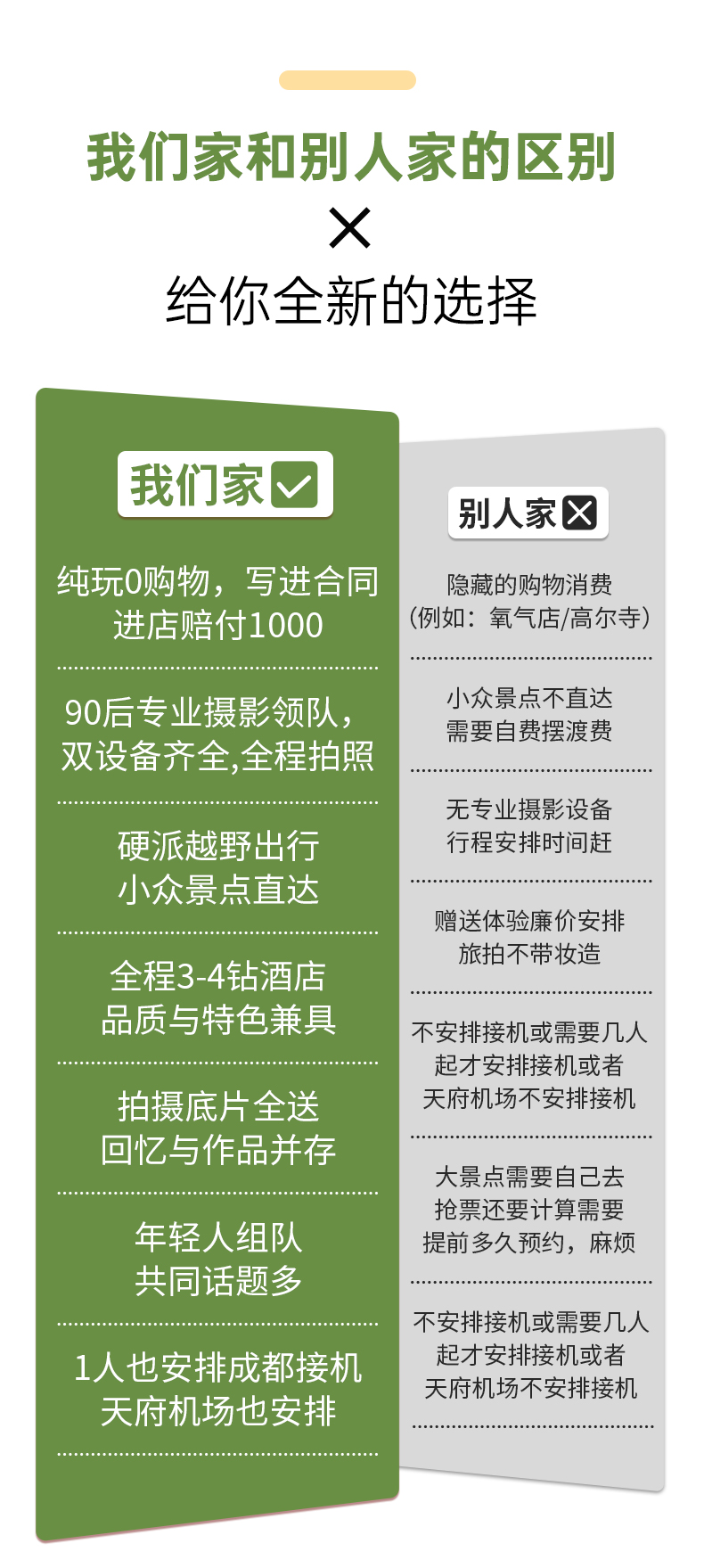 无人机+单反旅拍(底片全送+9张精修照片+1条精剪视频),底片全程不低于40张,无人机视频不低于3条(全车人拍摄旱地拔葱视频,晚上领队带大家星空拍摄);