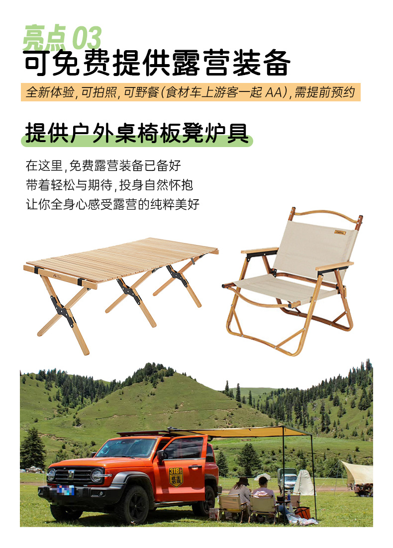 可免费提供露营桌椅板凳炉具,可以野餐(食材车上游客一起AA),需提前预约;
