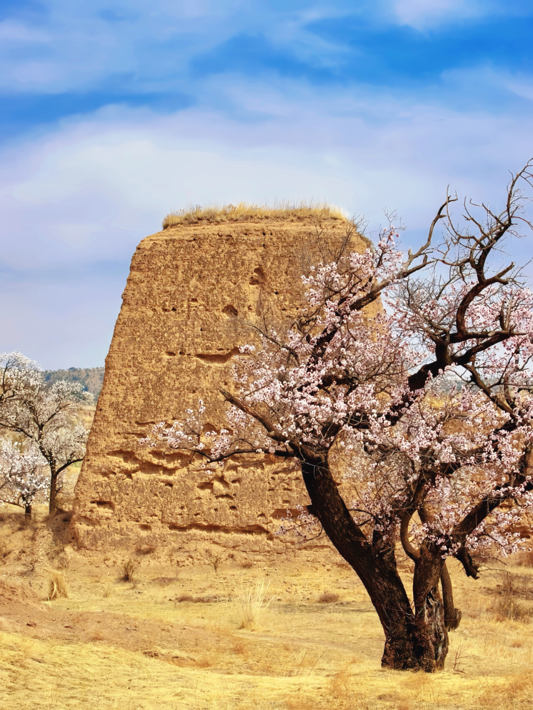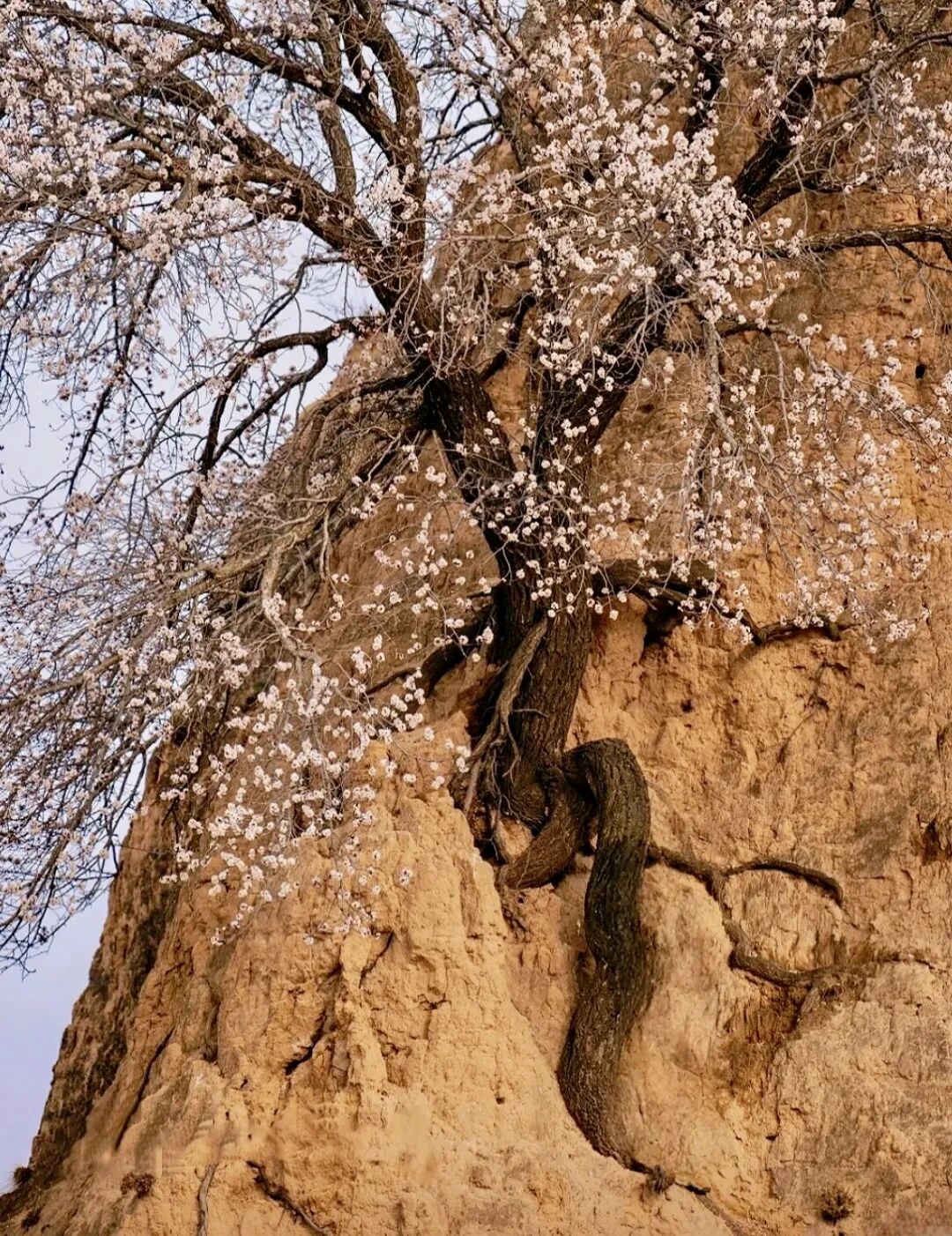 而4月的主角,是散落于长城脚下的百年杏树。虬曲的枝干托起如雪的杏花,与身后苍黄的土长城构成极致的视觉冲击——刚与柔、枯与荣、历史与当下,在这一刻同框。