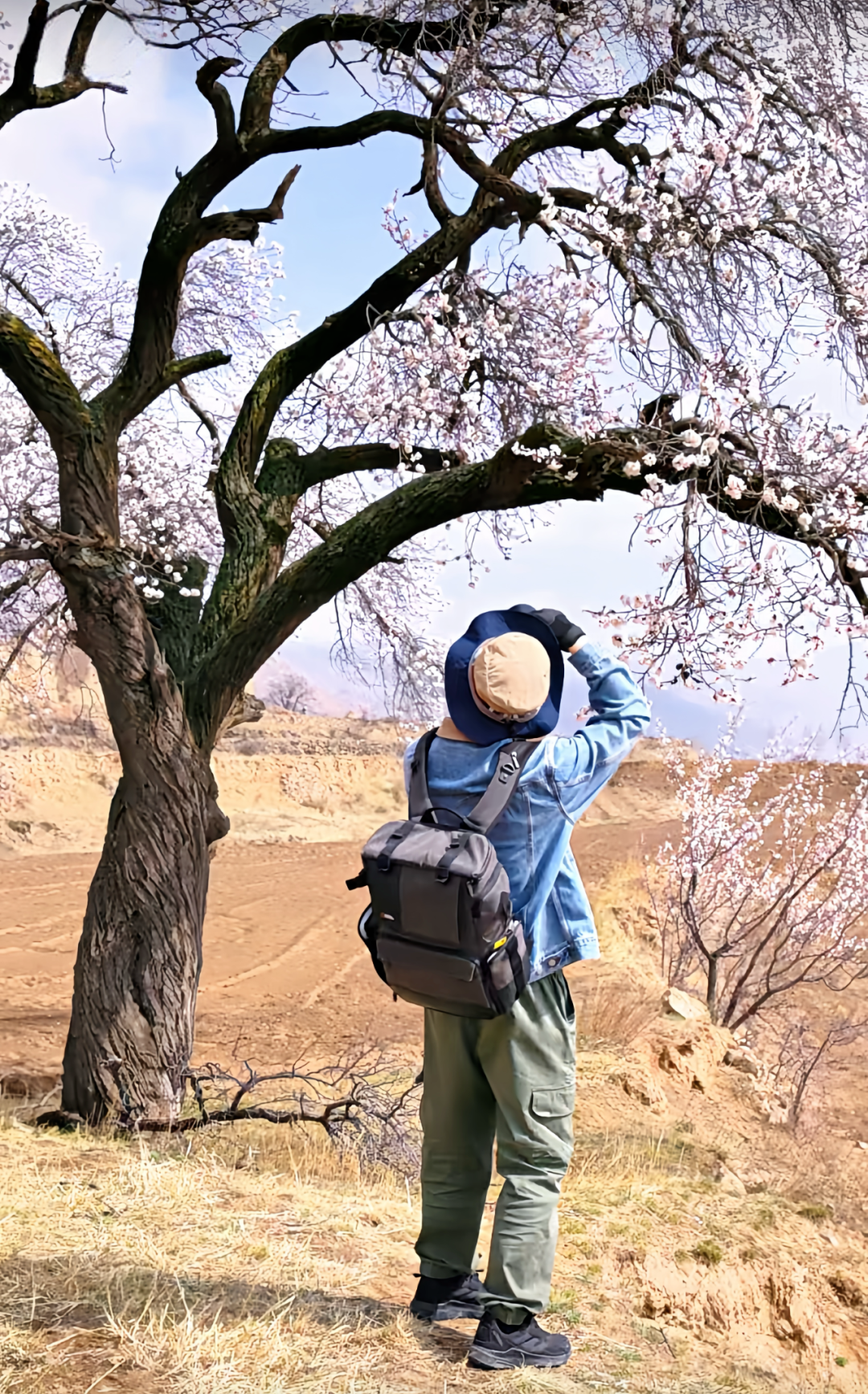 - 阳高县被誉为“三晋杏乡”,四月正是杏花怒放时。村口的夯土城墙与烽火台残迹,风化形成的沟壑如天然浮雕。深入村内,残存的城门、夯土民居与村民晾晒的玉米辣椒,构成一幅鲜活的塞北生活图卷。偶遇当地老人,或许能听上一段“胡服骑射”的边塞往事。跨过河谷,漫山遍野的杏树扑面而来。东面那片已达百年树龄,开起来如云似霞,遮天蔽日。我们在杏林中穿行、拍摄,看长城的萧瑟与杏花的纷繁,在同一个画面里达成和解。今天的徒步,我们将走上长城之巅。宽不足一米的墙顶小道,两边是断壁沟壑,耳畔是西风呼啸。那一刻,整个人也如风中的枯草,在历史与自然的力量中摇曳。