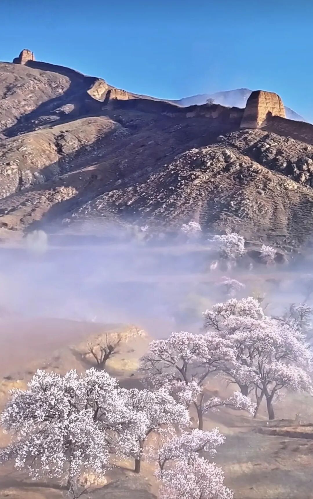 徒步至高点回望,整条错长城尽收眼底。偶有火车从杏花林中穿行而过,现代与历史的交织,为这幅苍凉画卷添上一分生动。
