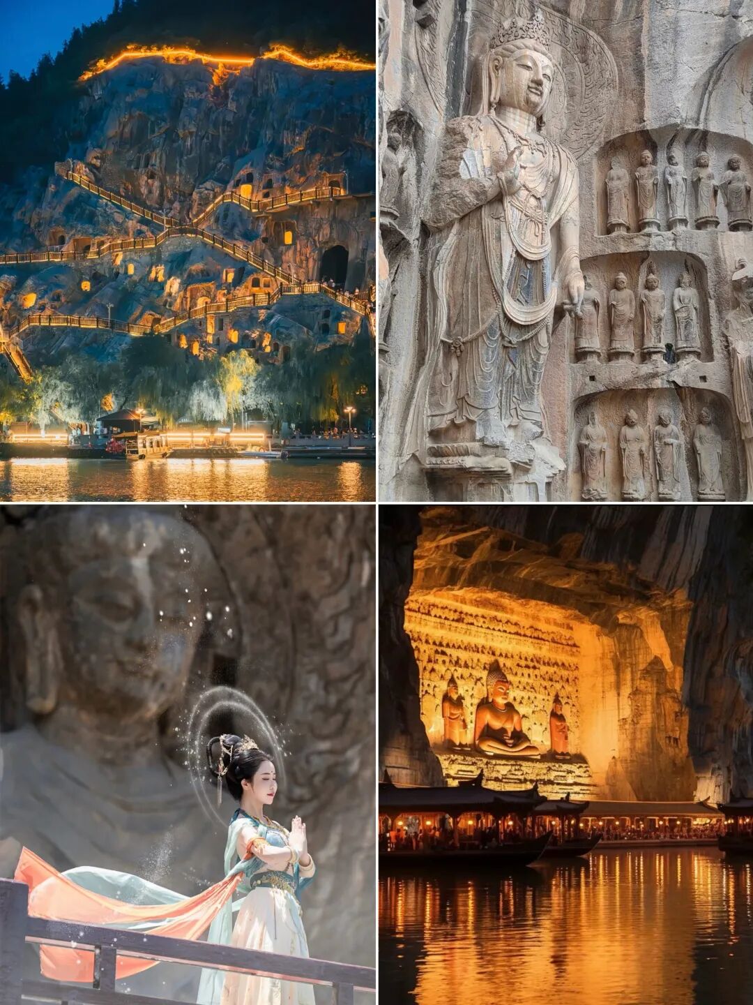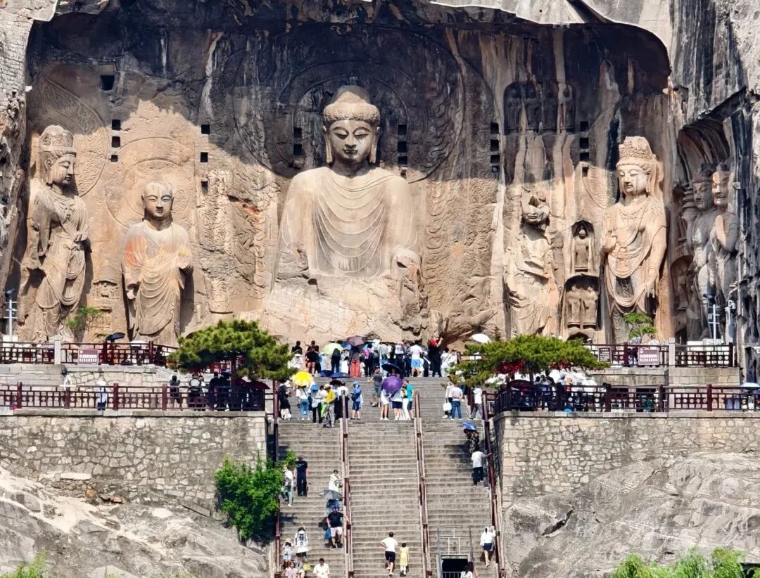 龙门石窟中国石刻艺术宝库之一,是国家AAAAA级景区,位于洛阳南郊伊河两岸的龙门山与香山上。开凿于北魏孝文帝年间,之后历经东魏、西魏、北齐、隋、唐、五代的营造,南北长达1公里,今存有窟龛2345个,造像10万余尊,碑刻题记2800余品。