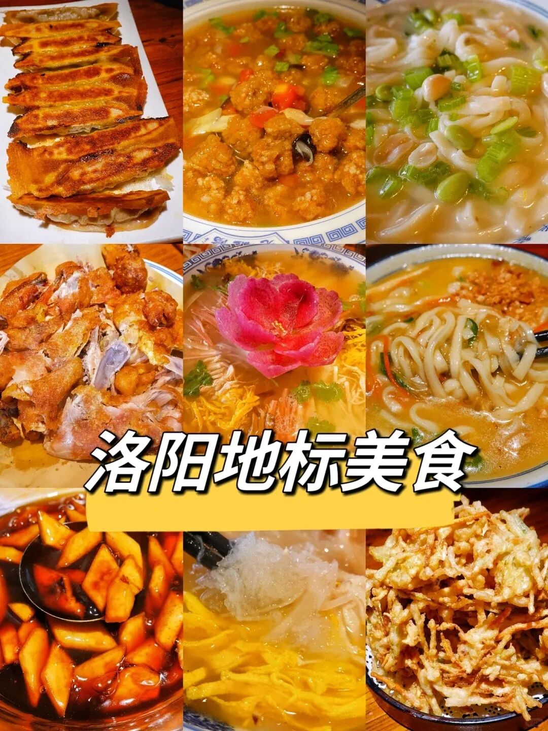 洛阳美食牛肉汤、胡bai辣汤、凉皮、烤面筋、白吉馍、羊肉汤、水煎包、炒凉粉、锅贴、油璇、连汤肉片等。