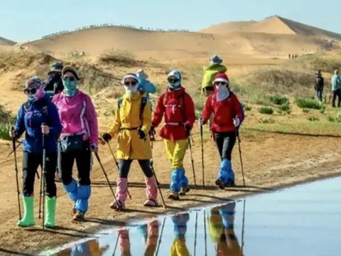 3)沙尘暴:库布齐沙漠的沙尘暴发生的概率极低,即使发生强度也不会很大,所以并不会带来危险,而且沙尘并不耽误人的正常行走,只是行军速度会减慢。遇到沙尘时带上防风镜、口罩、头巾,在凉爽的沙尘里行军也是一种独特的享受。