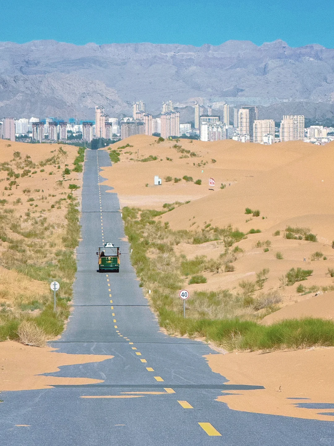 网红公路景色真的超美,无尽的沙海,望不到边,景区和城市遥相呼应,走在景区内,放眼望去就能看到高楼大厦,仿佛在沙漠看到了海市蜃楼!一个个沙丘此起彼伏,在太阳的照射下闪耀着金色的光芒!
