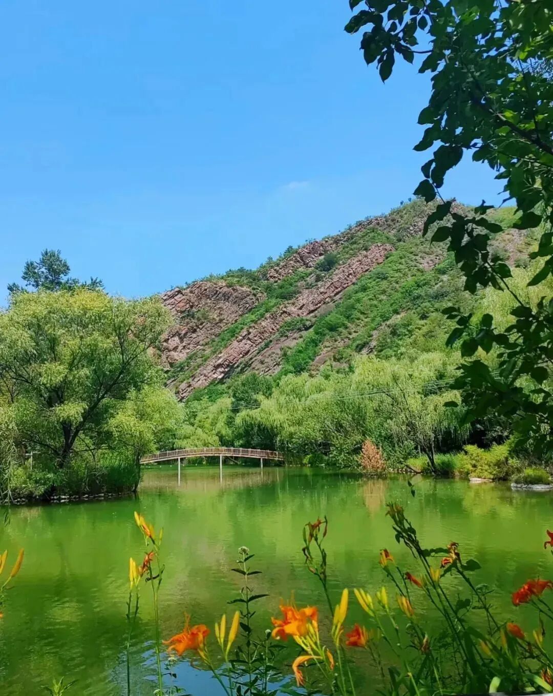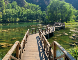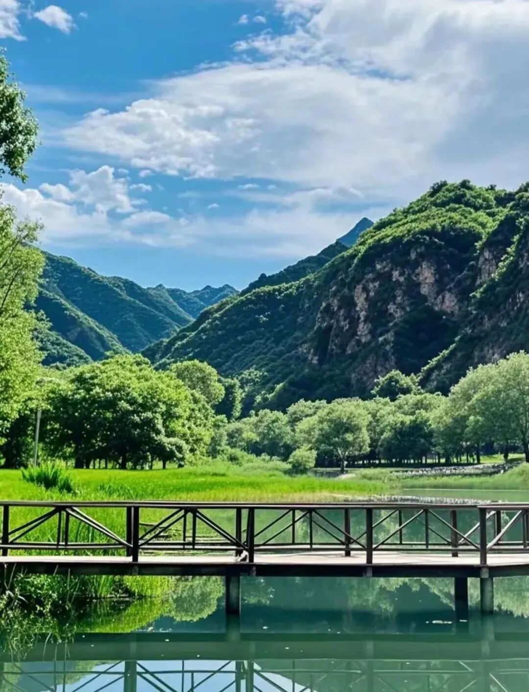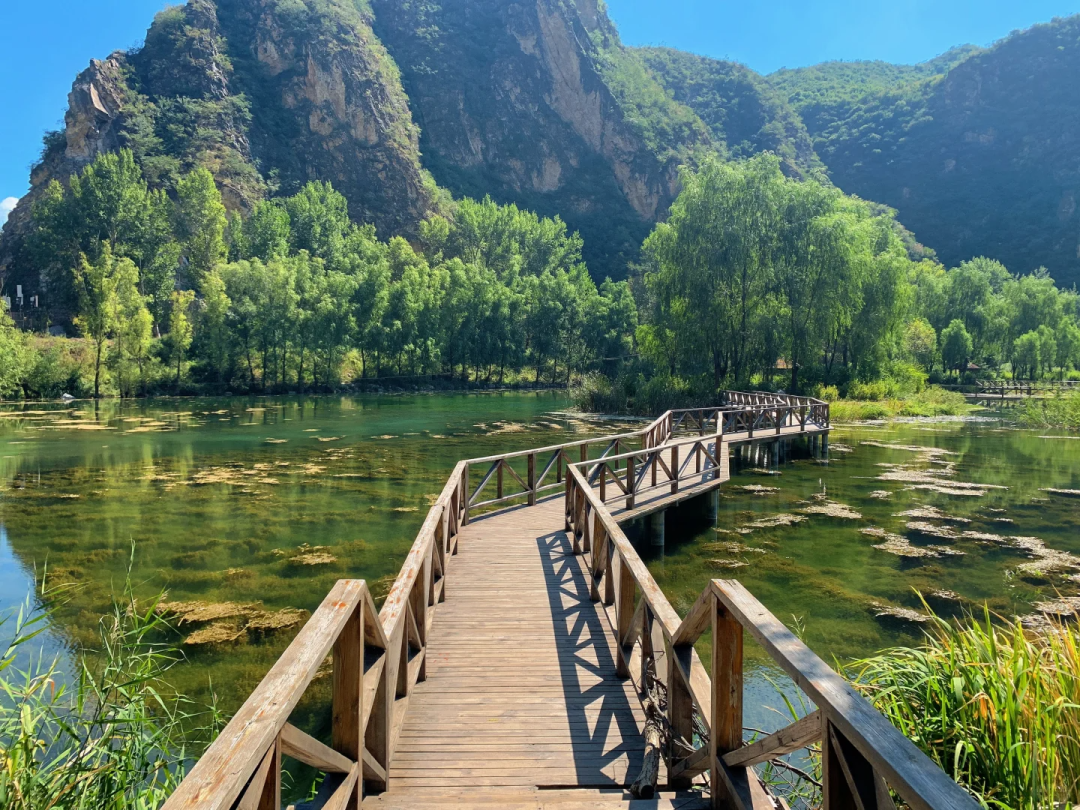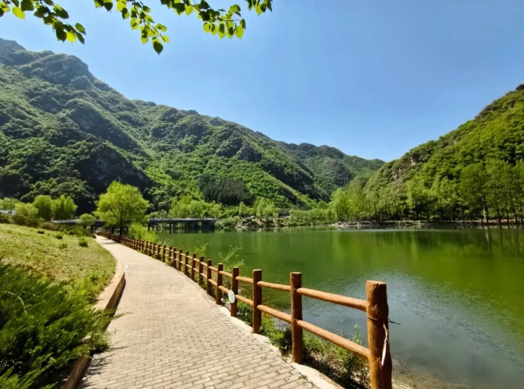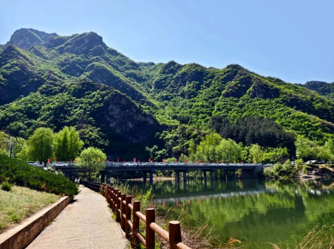 - 适时集合,我们前往【百里画廊】游览,首先游览『干沟』。车行至干沟,见百里山水画廊之标牌、为官方确定的画廊起点。这里有北京旅游咨询服务处,可获得画廊线路上的景点等信息。干沟村,也是百里画廊景区内的起始村,依山傍水,环境清幽。- 适时集合前往『奶山湖』游览。
