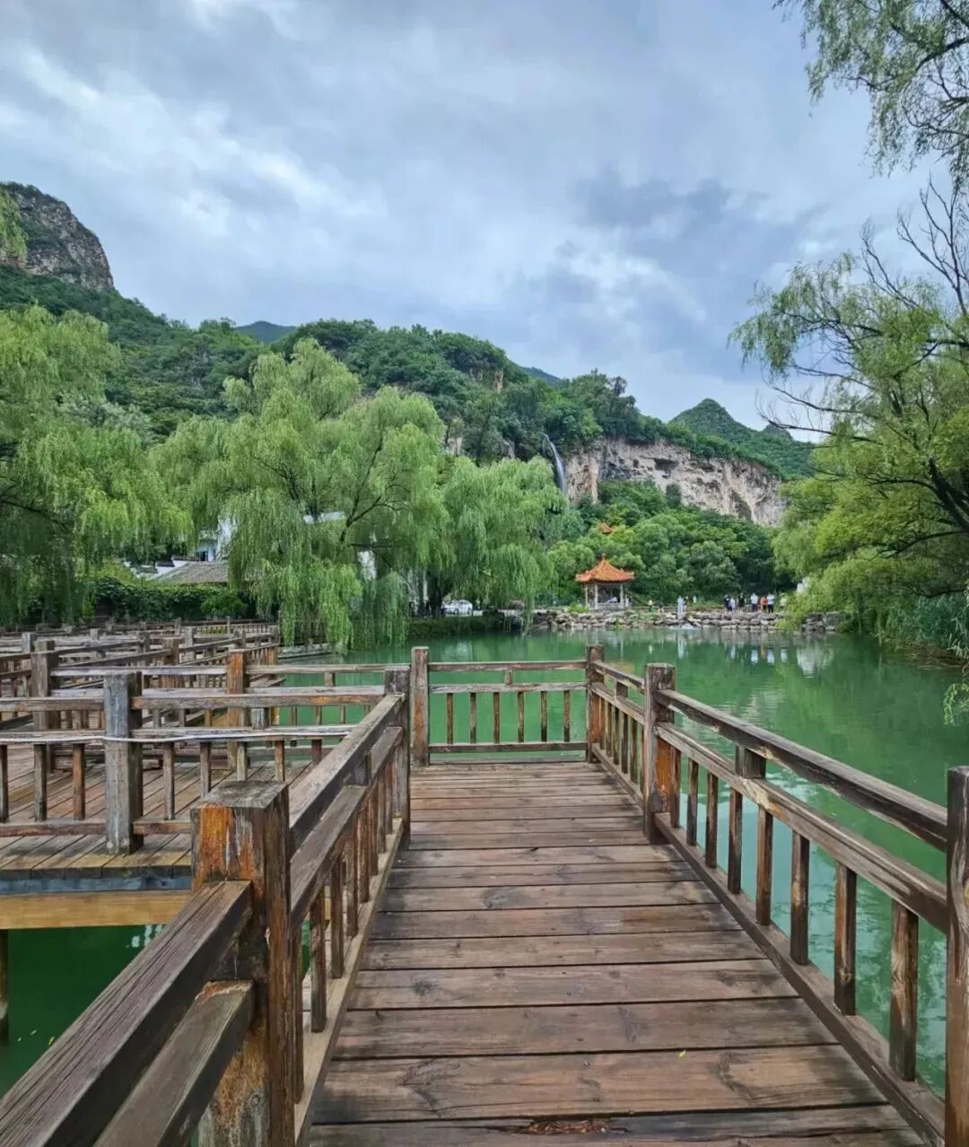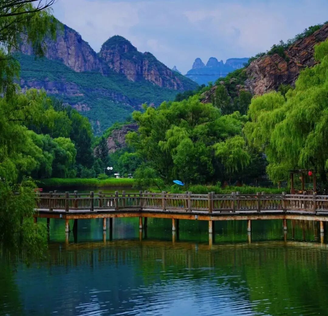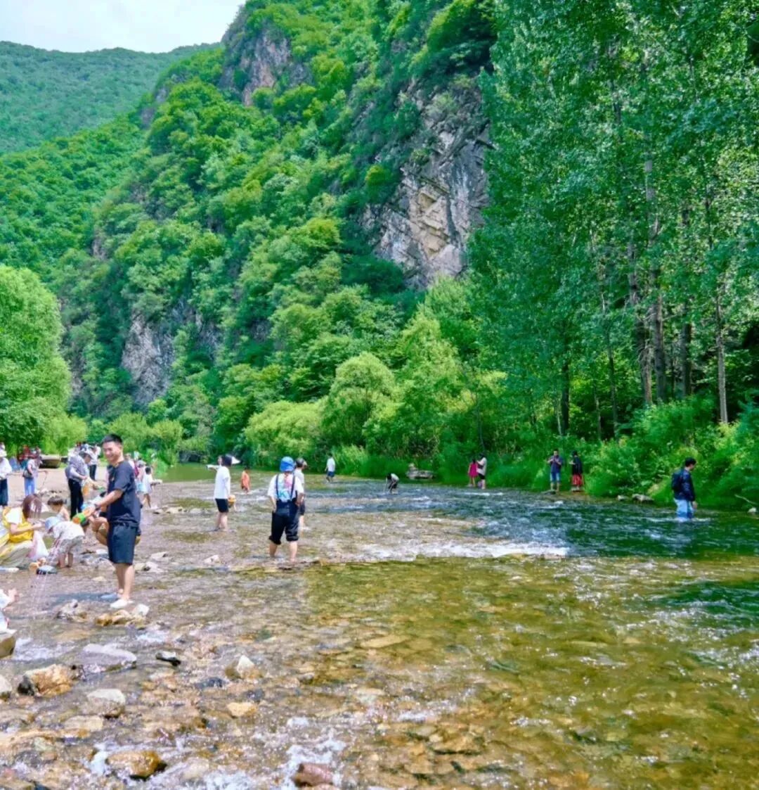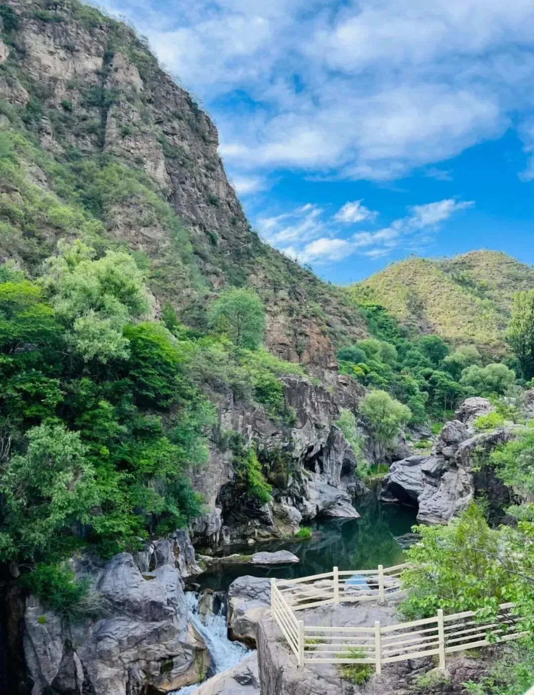 - 适时集合,我们前往【百里画廊】游览,首先游览『干沟』。车行至干沟,见百里山水画廊之标牌、为官方确定的画廊起点。这里有北京旅游咨询服务处,可获得画廊线路上的景点等信息。干沟村,也是百里画廊景区内的起始村,依山傍水,环境清幽。- 适时集合前往『奶山湖』游览。