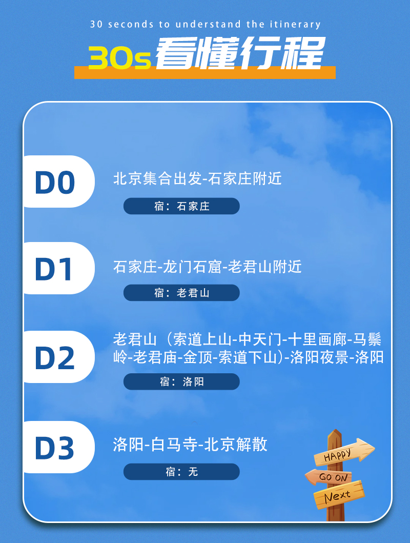 2)门票:老君山+中灵/云景往返索道团体220元,龙门石窟需提前官网预约行程当日下午时间段门票,白马寺预约行程当天最早时间段(门票价格供参考,以景区实际政策为准)。